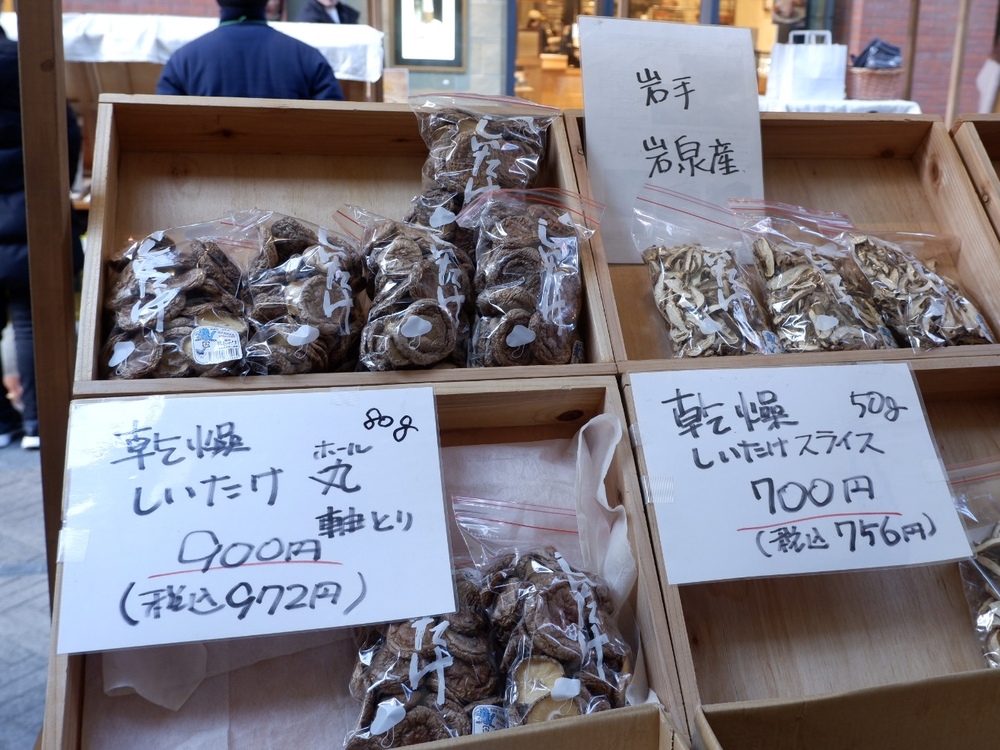 規格外のしいたけや、珍しいベビーしいたけの量り売りも興味深かったです。めんつゆで煮た岩手県産の干ししいたけを試食させていただきました。肉厚でおいしいです。