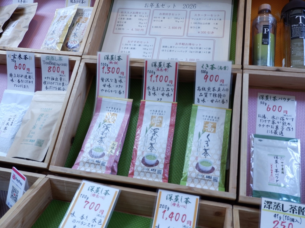 茎茶やほうじ茶、ティーバックのお茶、飴などバラエティー豊か。水出しにおすすめのボトルまで販売されています。