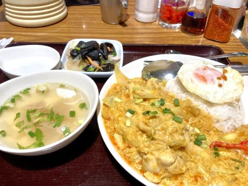 迷いに迷って、この日は「ガイパッポンカリーラーカオ(ふわふわ卵のチキンカレー)」のランチセット(ご飯少なめ、目玉焼き付き)を注文しました。