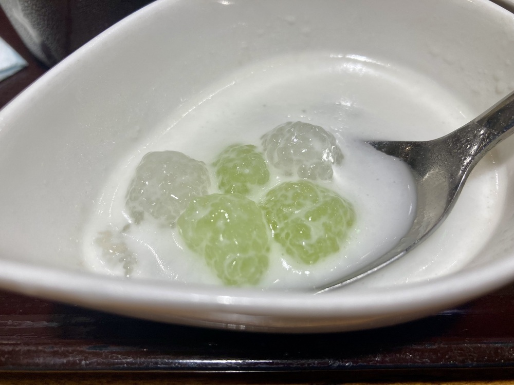翡翠色で美しく、モッチモチで大好きになりました。冷たく甘いココナッツ風味で、大満足のランチセットでした。