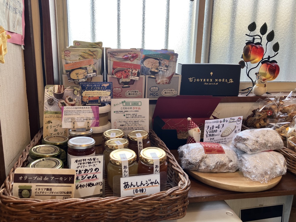 レジ前にはパンに合わせたいこだわりのジャムや、入り口の看板にあったシュトーレンやラスクが置いてありました。