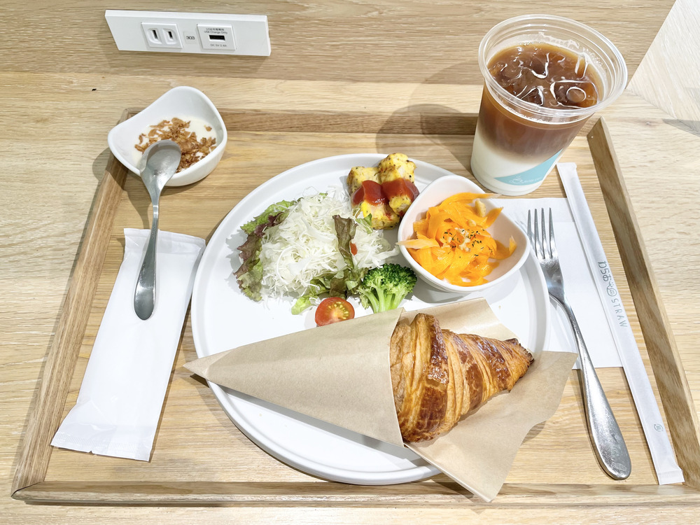 クロワッサンのほか、サラダ・スクランブルエッグ・ドリンクも付いていて、ボリューム満点でとってもお得なんです。