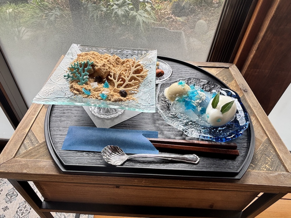 かわいらしい白うさぎと、透明感のある青いゼリー。きな粉を砂浜に見立て、サンゴのような繊細な飾りが立体感を添えています。まるで小さな海の景色を切り取ったかのような演出です。