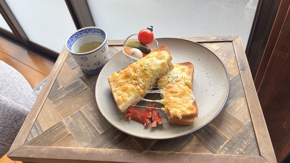 クロックムッシュは、チーズのコクとマッシュポテト、ハムのやさしい甘みが重なった一品。こんがり焼けたパンとの相性も抜群です。ボリュームはありながらも重すぎず、どこかほっとする味わい。最後まで飽きることなく、ゆっくりと楽しめました。