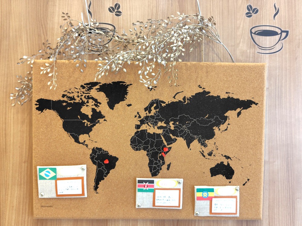 店内のおしゃれなボードは、世界地図上に産地の目印と各コーヒー豆の特徴が記載されています。