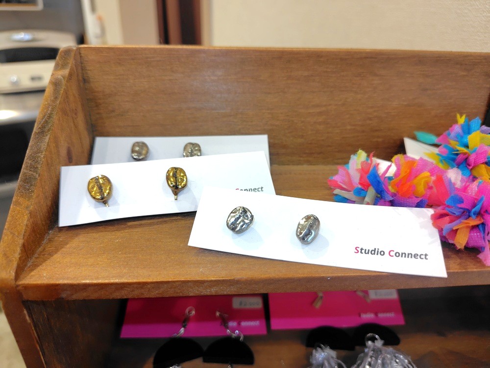 中でもコーヒー豆を使って作られたピアスやイヤリングが目を引きます。お店のコーヒー豆を使っているそうで、コーヒー愛が感じられるユニークなアイテムで、とってもかわいくて欲しくなりました!