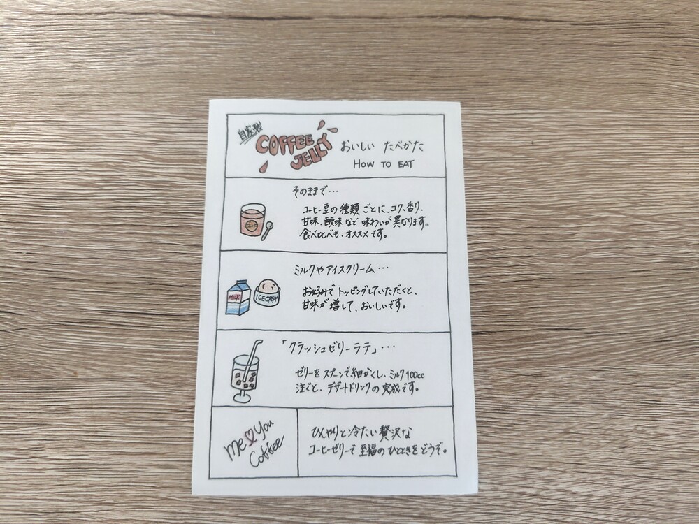 また、Me&You Coffeeの名物であるコーヒーゼリーは種類も豊富で、テイクアウトも可能です。店内でのカフェタイムはもちろん、お土産にもぴったりです。