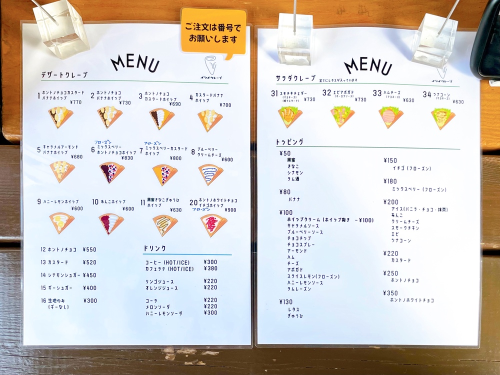 悩みに悩み、1番人気の「ホントノチョコバナナホイップ」とサラダクレープの「スモチキチェダー」を注文しました。
