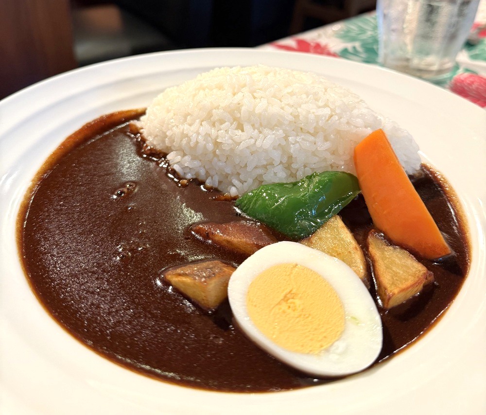黒めのカレールーに、野菜やたまごがトッピングされていて、見た目にも色鮮やかなプレートで提供されるのもうれしい。