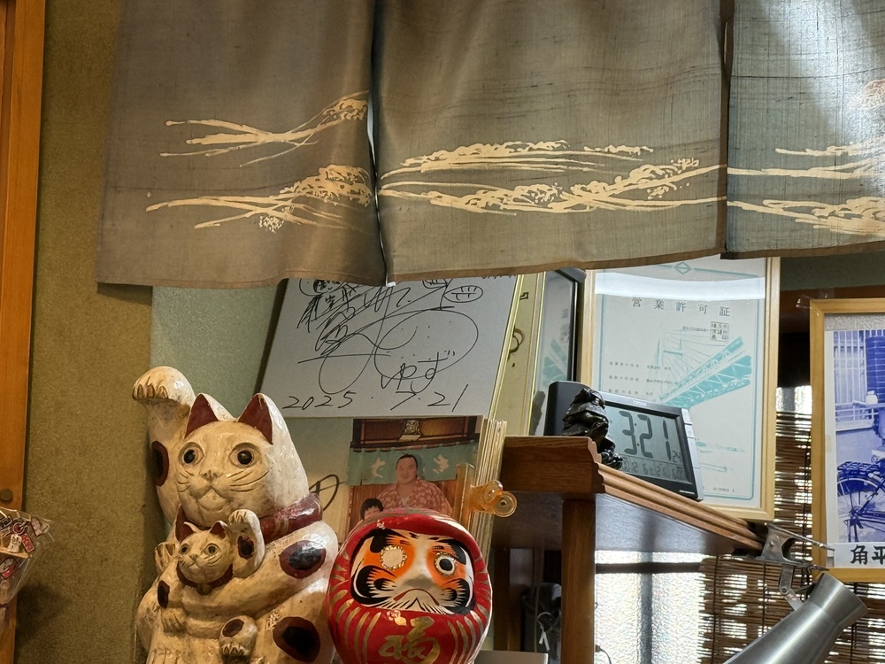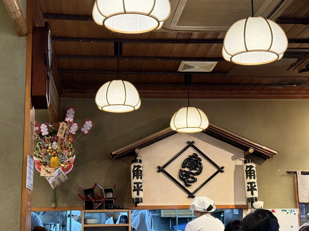 木の温もりのある天井。そこから吊り下がっている、おひなさま飾りのぼんぼりのような灯り。商売繁盛を祈願する大きな熊手やダルマ、招き猫などが飾られていました。