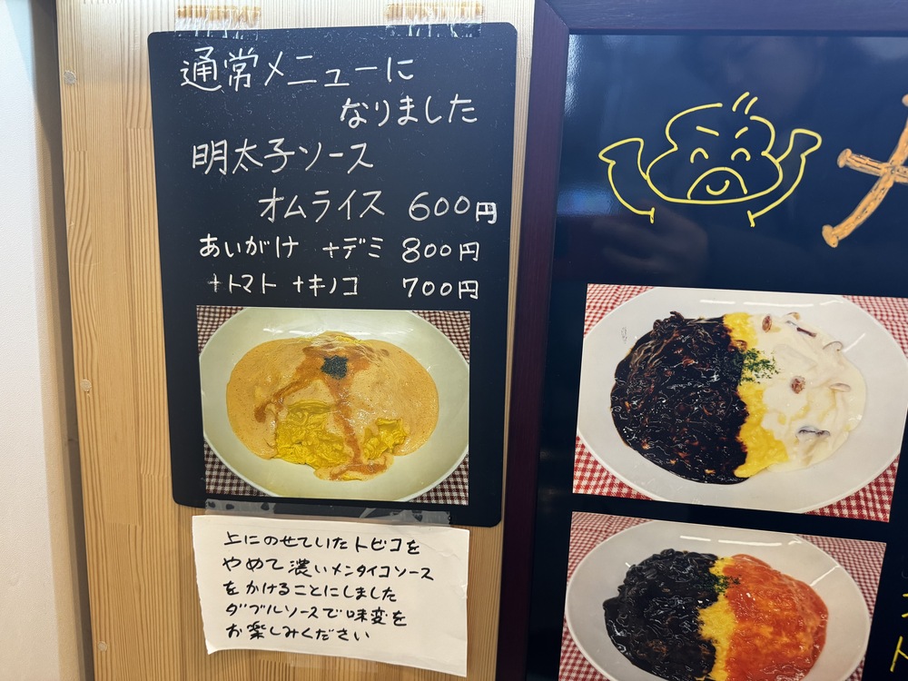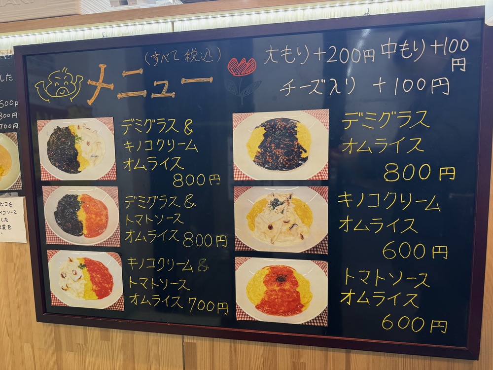 店主の優しさが感じられる手書きの看板メニューから、デミグラスやキノコクリームなど人気定番メニュー、そしてベーシックなトマトソースオムライスが目に飛び込んできます。