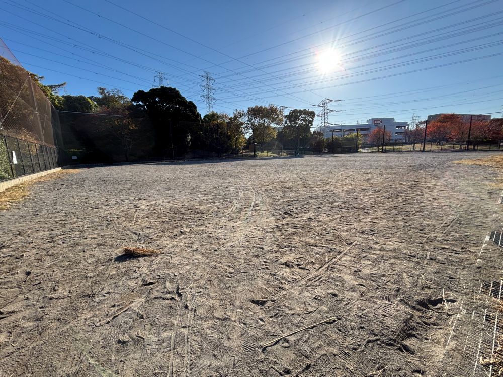 芝生エリアの横には、学校の校庭のような広めのグラウンドがあります。