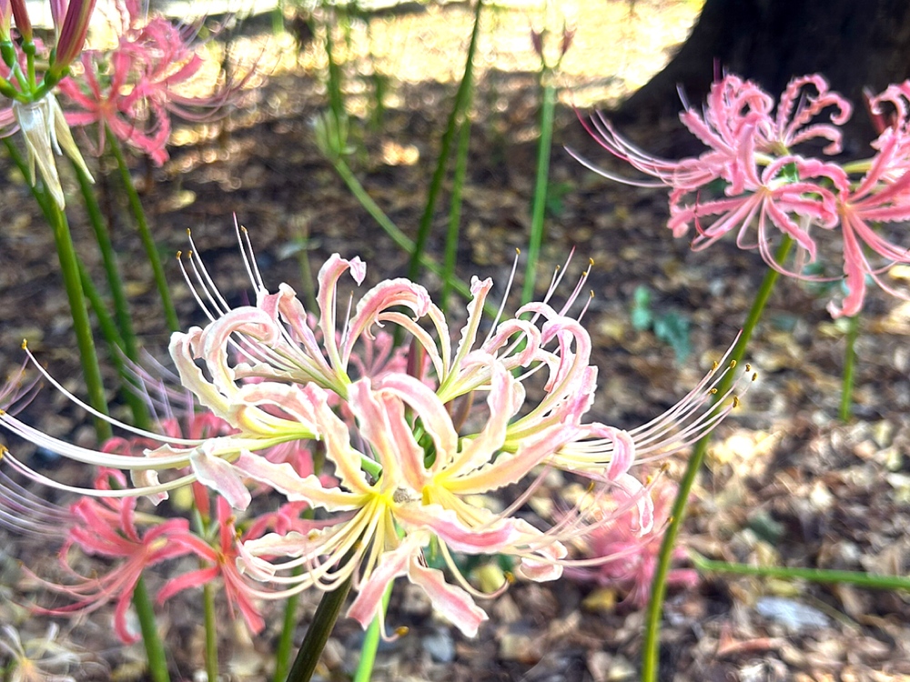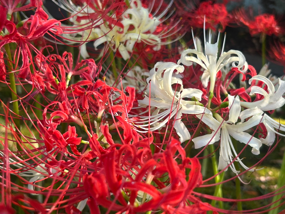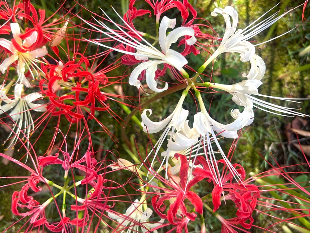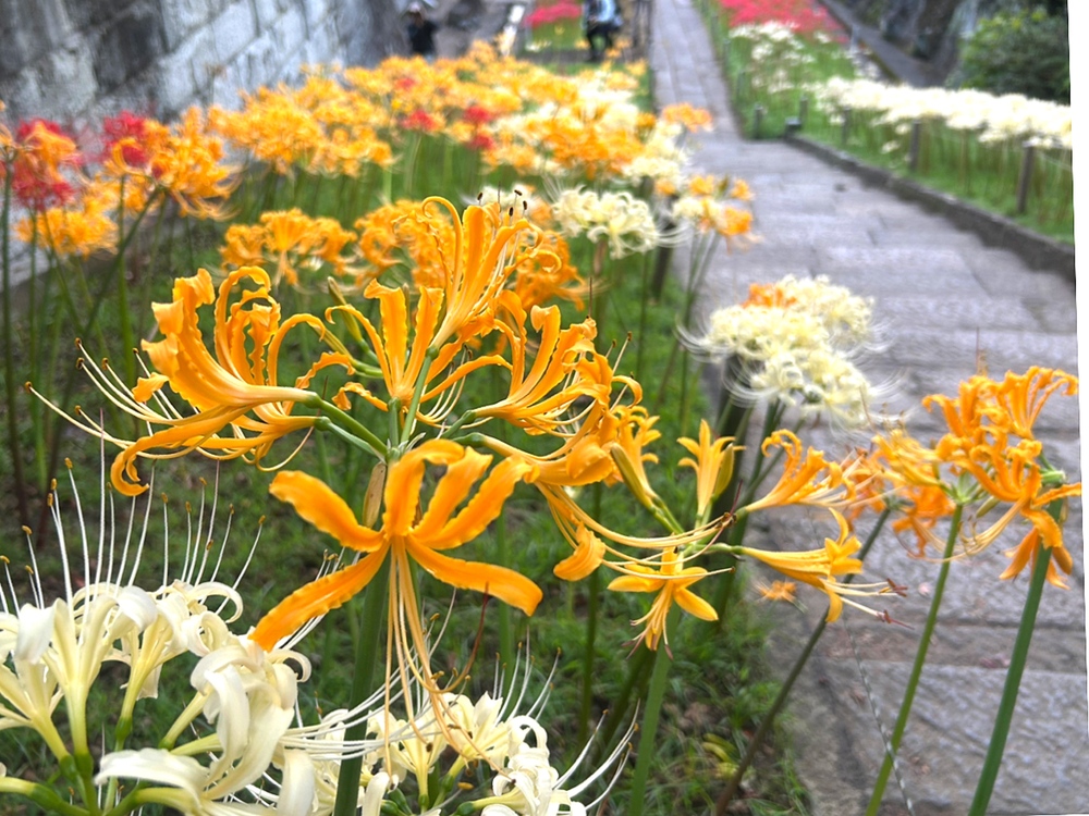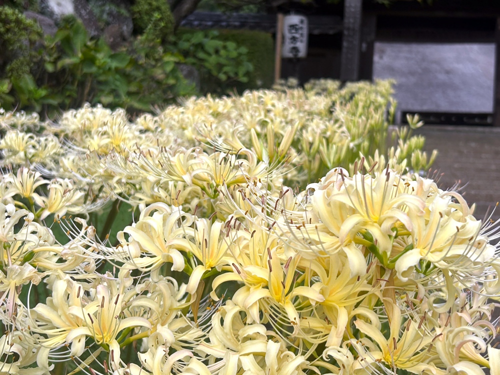 西方寺さんの彼岸花は赤だけでなく、白や黄色、ピンクなど珍しい色合いのものもあります。
