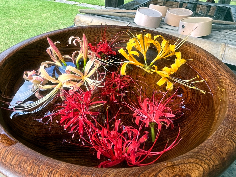 山門をくぐった右側にある手水にも、カラフルな彼岸花が浮かべてありました。