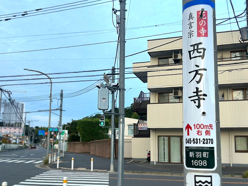西方寺さんがあるのは、横浜市営地下鉄ブルーラインの新羽駅から、港北産業道路沿いに5分ほど歩いた場所。